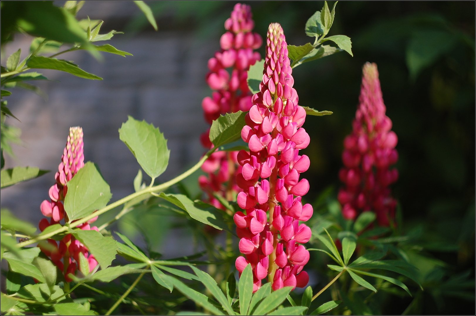 Вдруг вечером, в узкую щель между двумя высотками, проскользнул лучик вечернего солнца... и осветил очень темный уголок)). Интересно, что кустик люпина этого цвета появился, когда я уже его совсем не ждала. Так что - подарок...))