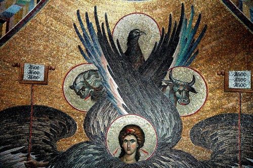 "…перед престолом море стеклянное, подобное кристаллу; и посреди престола и вокруг престола четыре животных, исполненных очей спереди и сзади. И первое животное было подобно льву, и второе животное подобно тельцу, и третье животное имело лице, как человек, и четвертое животное подобно орлу летящему. И каждое из четырех животных имело по шести крыл вокруг, а внутри они исполнены очей; и ни днем, ни ночью не имеют покоя, взывая: свят, свят, свят Господь Бог Вседержитель, Который был, есть и грядет". Откр. 4:6-8