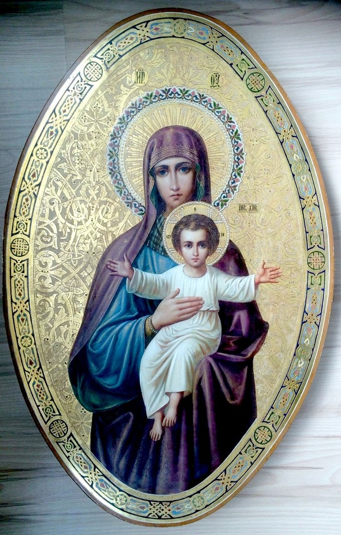 Пресвятая Богородица, держащая на руках Предвечного Младенца, изображена в полный рост и в окружении ярко-красной мандорлы с исходящими от нее сияющими лучами. Этот образ имеет также наименование «Что Тя наречем?», происходящее из текста Богородична 1-го часа, начертанного по краю сияния, исходящего от Божией Матери: «Что Тя наречем, о, Благодатная? Небо, яко воссияла еси Солнце Правды; рай, яко прозябла еси Цвет нетления; Деву, яко пребыла еси нетленна; Чистую Матерь, яко имела еси на святых Твоих объятиях Сына, всех Бога. Того моли спастися душам нашим».