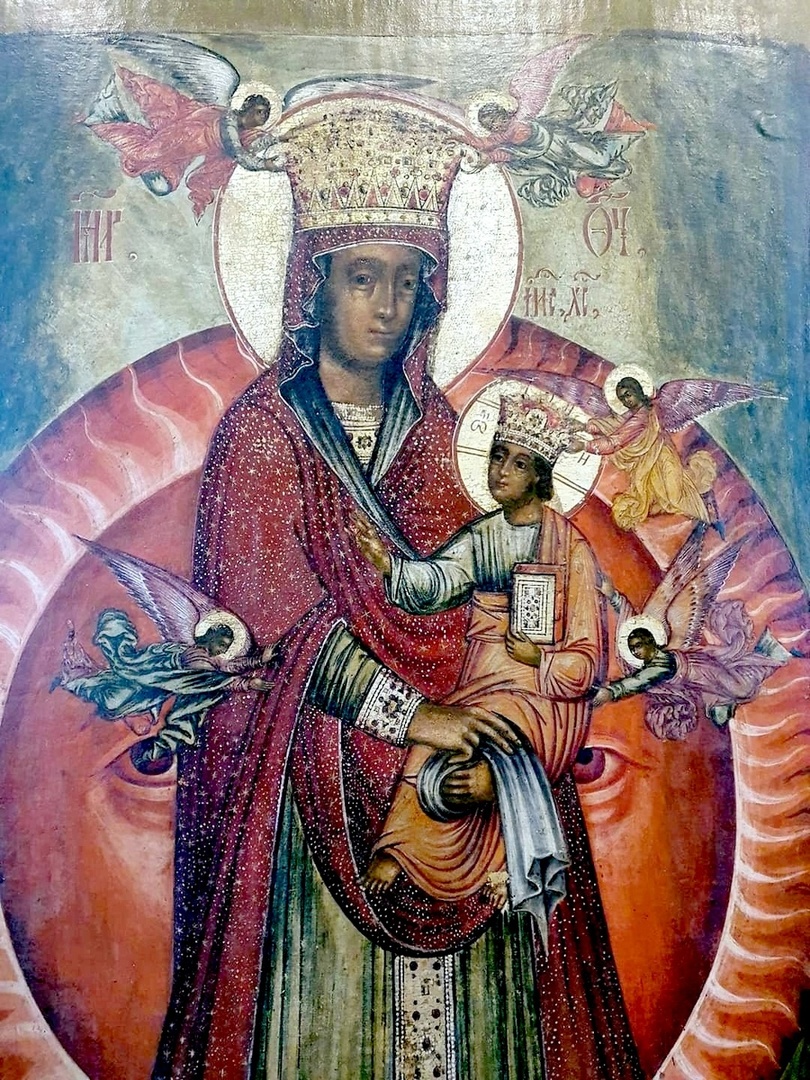 Иконографическое изображение Пресвятой Богородицы, под ногами Которой первоначально был изображен лунный серп, иллюстрирует слова Откровения Иоанна Богослова: И явилось на небе великое знамение: жена, облеченная в солнце; под ногами ее луна, и на главе ее венец из двенадцати звезд... И родила она младенца мужеского пола, которому надлежит пасти все народы жезлом железным; и восхищено было дитя ее к Богу и престолу Его (Откр.12:1,5).