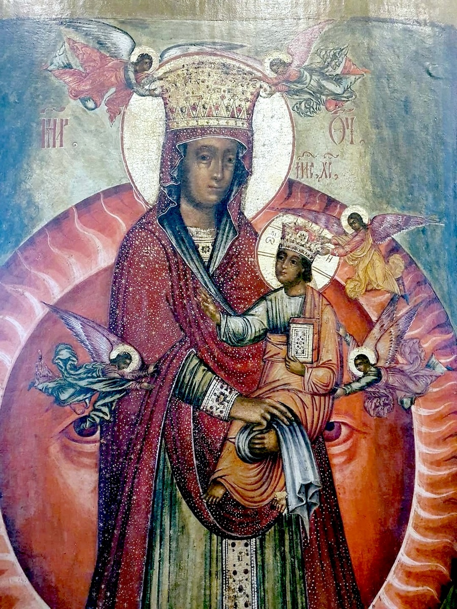 Икона Божией Матери "Благодатное Небо" ("Что Тя наречем"). Россия, начало XVIII века (?). Фрагмент.