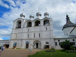 Собор и звонница удачно гармонируют друг с другом, хотя времена их строительства разделяет более чем одно столетие. Фасады звонницы расчленены по вертикали плоскими выступами — лопатками; а по горизонтали — тремя поясками. В нижних этажах находится церковь Входа Господня в Иерусалим и хозяйственные помещения. Верхний этаж представляет собой открытую площадку с четырёх пролётной аркадой. Каждый из пролётов огорожен ажурной металлической решёткой и завершён вверху килевидной закомарой, над каждым из пролётов на круглом барабане поставлена глава, увенчанная крестом. На верхний этаж ведёт крутая, узкая внутристенная лестница, на фасаде выявленная крошечными оконцами. От пролётов с колоколами до земли звонница имеет сплошные пустоты, что делает здание превосходным резонатором. Близость звонницы к открытому пространству озера Неро усиливает акустический эффект.