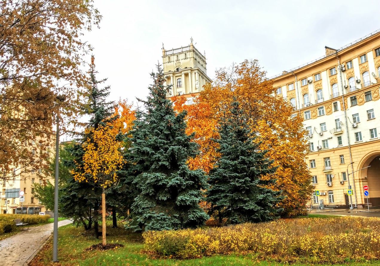 И мимо нельзя нам пройти без восторга, Красивы они - просто радуют взгляд! На тёмно-зелёных, пушистых иголках - Осенние листья огнями горят!