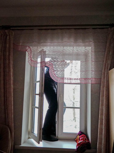 Андрей (коллега по работе) сбивает сосульки.