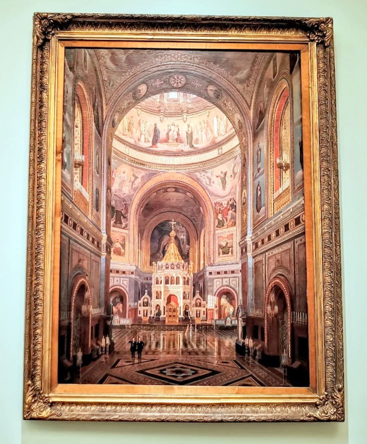 Картина Федора Клагеса передает ощущение грандиозности и величия, торжественности и благолепия, которое возникает при взгляде на внутреннее убранство собора, посвященного Христу Спасителю.