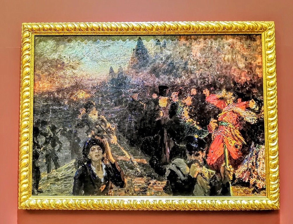 Очередным шагом Репина в направлении живописного обобщения изображения стало произведение, посвященное 100-летнему юбилею победы России над армией Наполеона. Фигуры, предметы и даже постройки как бы растворяются в красно-коричневой гамме огня и дыма горящего города. Запечатленная сцена близ стен Московского Кремля превращается в фантасмагорию, где с трудом различимы некоторые персонажи — падающий мужчина в красной одежде, священнослужитель с озаренным светом лицом, идущий солдат и кричащая женщина на ближнем плане. В этом произведении художник интуитивно предчувствовал наступление драматических событий Первой мировой войны.