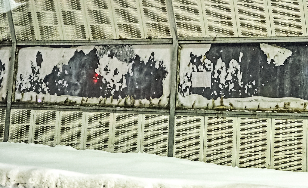 Стена на мосту, на стёклах которой множество снежных сюжетов.