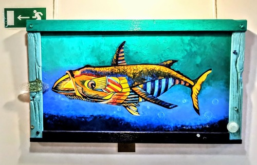 Как ни странно, но первое, что привлекает — рамы. И их следовало бы характеризовать отдельно, потому что они существенно дополняют повествование. Даже на фото виден «экологический» посыл, где рыба окружена пластиком.
