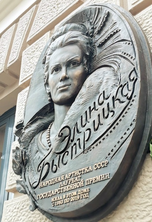 Над созданием мемориальной доски работал народный художник России Салават Щербаков. В центре барельефа расположен портрет Элины Быстрицкой, который дополняют роза и зрительские ряды, плавно переходящие в кинопленку.