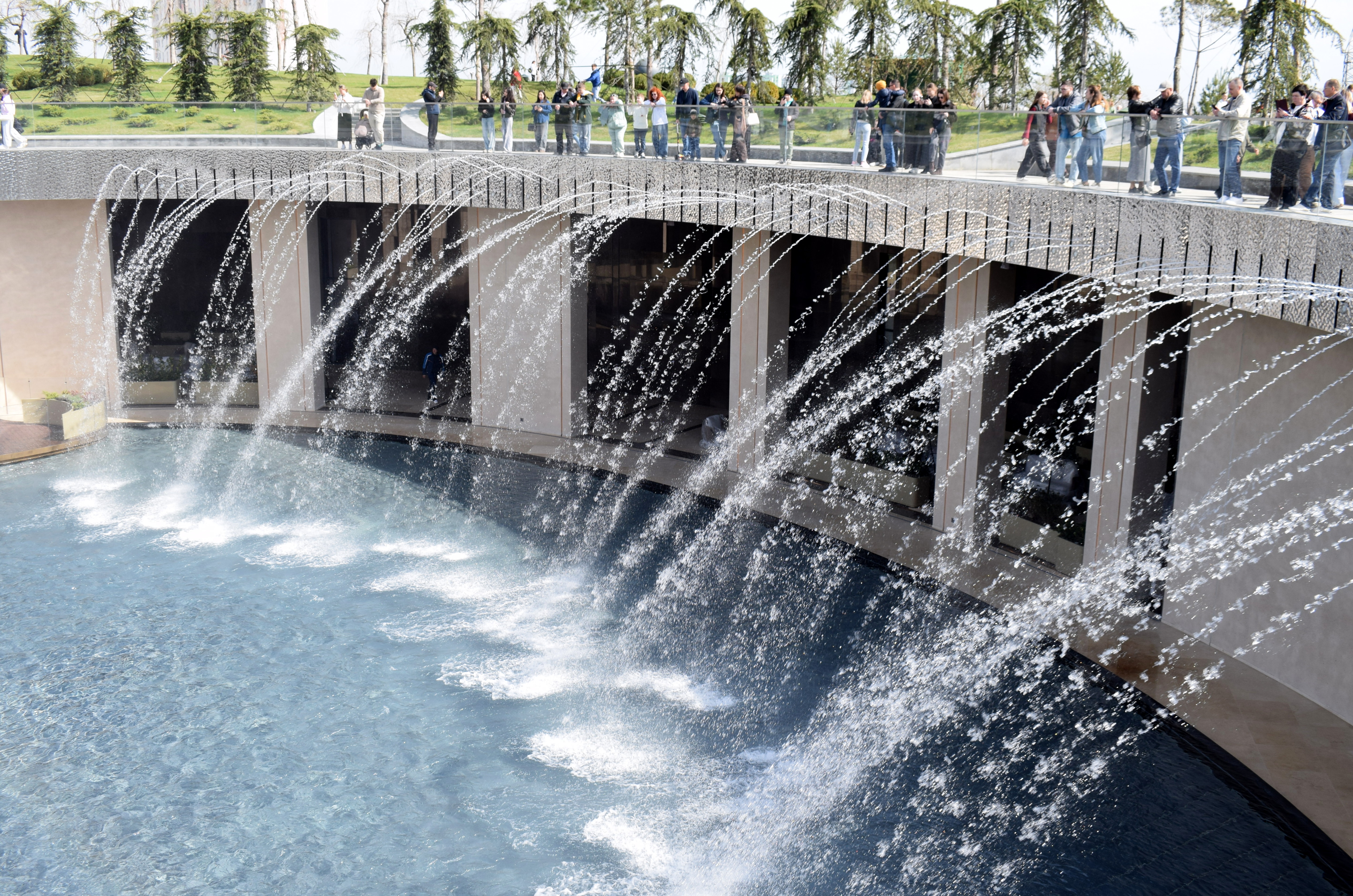 Это двухуровневый фонтан, созданный в холме: верхний - с прогулочной зоной, нижний - с внутренними галереями. Его струи бьют с разным ритмом и скоростью. По вечерам дополнительно визуальный эффект создаёт разноцветная подсветка.